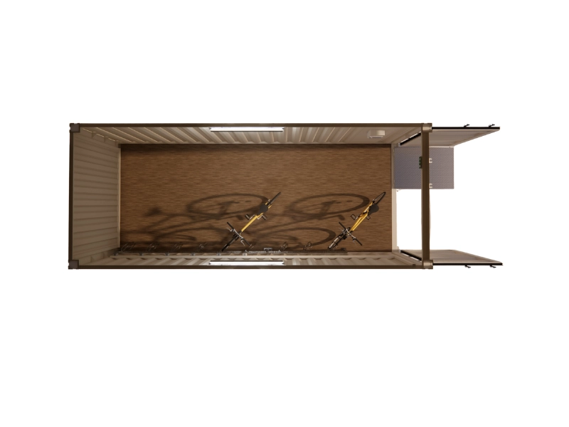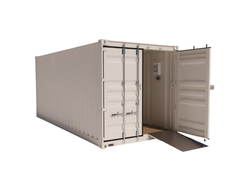 Base : Container maritime 20 pieds Dry premier voyage. Structure, parois et portes en acier Corten. Intégrité structurelle et étanchéité garanties. Plancher bois marine de 28 mm d’épaisseur.
