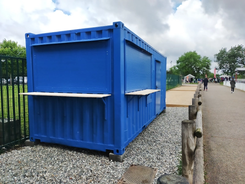 Container maritime 20 pieds aménagé en bar ou buvette. Deux auvents verrouillables. Electricité et éclairage. Tablettes fixe. Peinture couleur au choix. Surface environ 14 m².